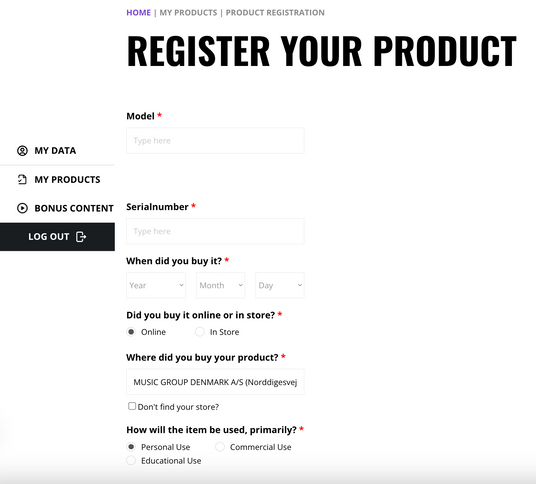 Next, you need to register your purchase, meaning you must enter which model you bought, as well as the serial number (the serial number is often found on the back of your device, usually marked S/N:), when you bought it, and where. Here it is important that you select our legal name “MUSIC GROUP DENMARK A/S” for the process to succeed.