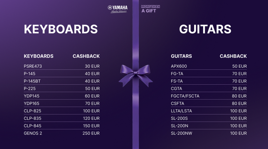 In this campaign, you have the opportunity to receive cashback after your purchase of selected musical instruments. This means an amount of money that will be deposited into your account after your purchase.