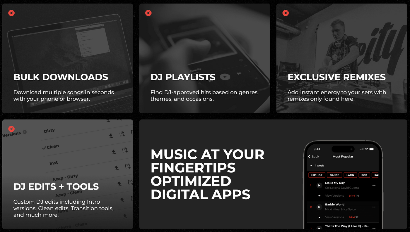 Como digital record pool, DJcity ofrece a los DJs profesionales acceso a nuevos tracks, remixes, intro edits y mashups, a menudo antes de que se publiquen oficialmente en otros lugares.