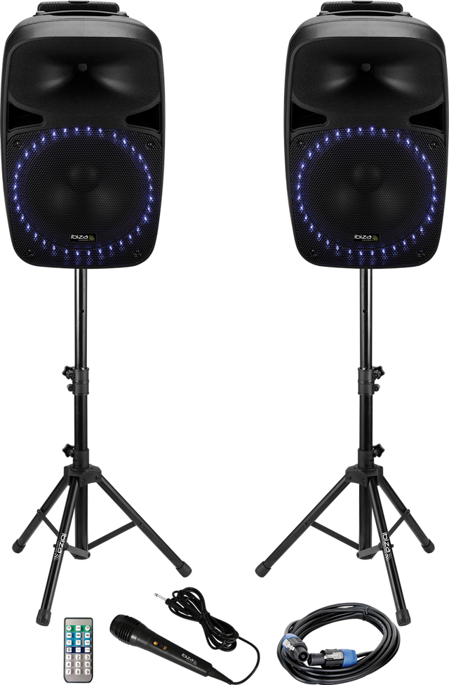 Sistema de sonido completo con micrófono, control remoto y altavoces con luz.