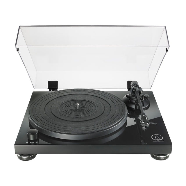 A critical aspect of the AT-LPW50PB's performance is its tonearm, which is a straight, carbon-fiber model. The tonearm is lightweight yet rigid, allowing it to track the grooves of a record with precision. Carbon fiber is known for its excellent damping properties, which help to reduce vibrations that could otherwise affect playback quality. The adjustable tracking force and anti-skate control provide further precision, allowing users to fine-tune the tonearm's performance according to their preferences and the specific characteristics of their records. This level of customization ensures that the stylus tracks the record grooves accurately, minimizing distortion and delivering clear, detailed sound.