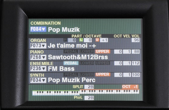 - Guarda tus configuraciones favoritas en patches. La sección de órgano y sintetizador tiene 100 patches cada una, mientras que las secciones de piano y ensemble tienen 300 configuraciones de fábrica y 400 patches de usuario.