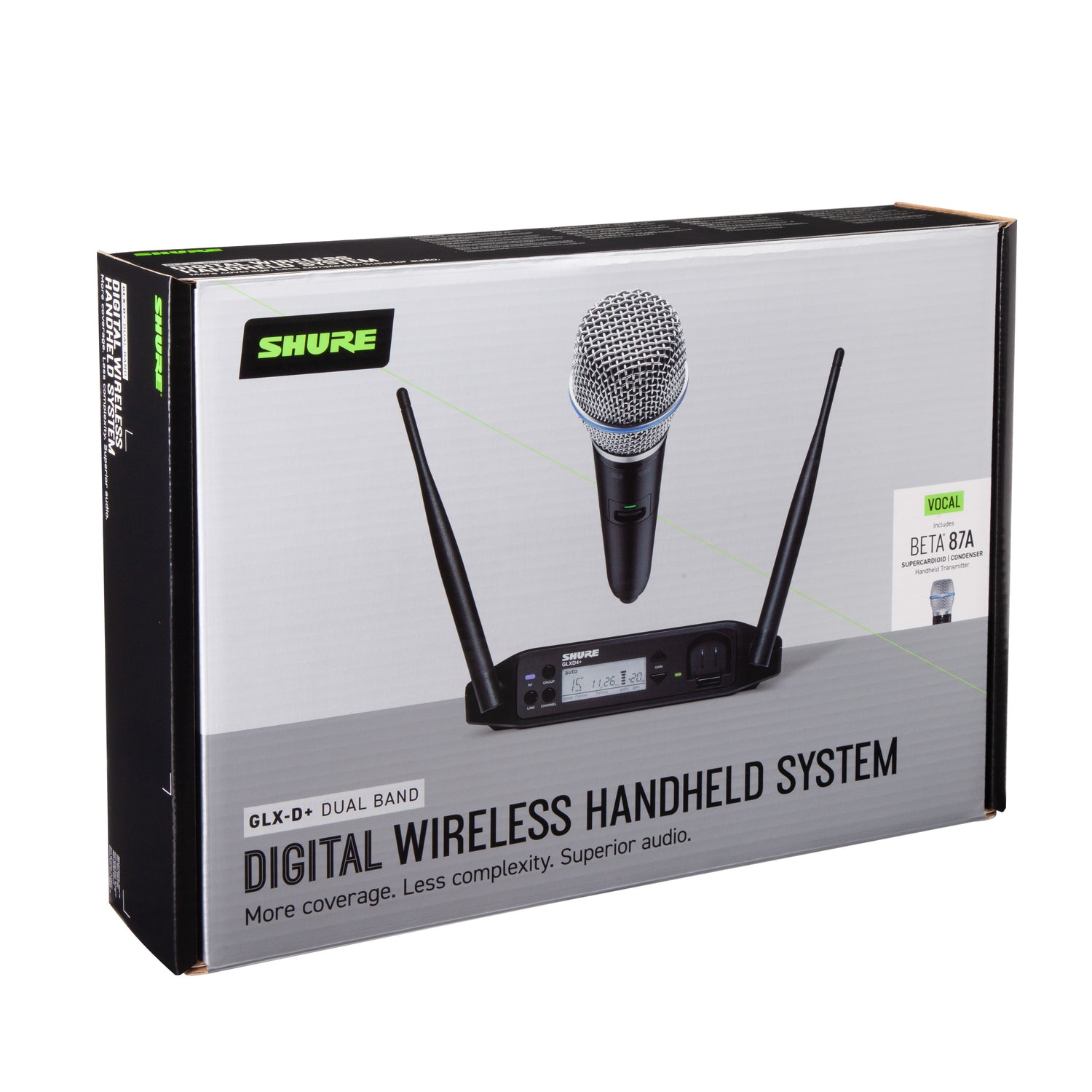 - Beta87A condenser vocal microphone with built-in transmitter and tabletop GLXD4+ receiver with up to two channels