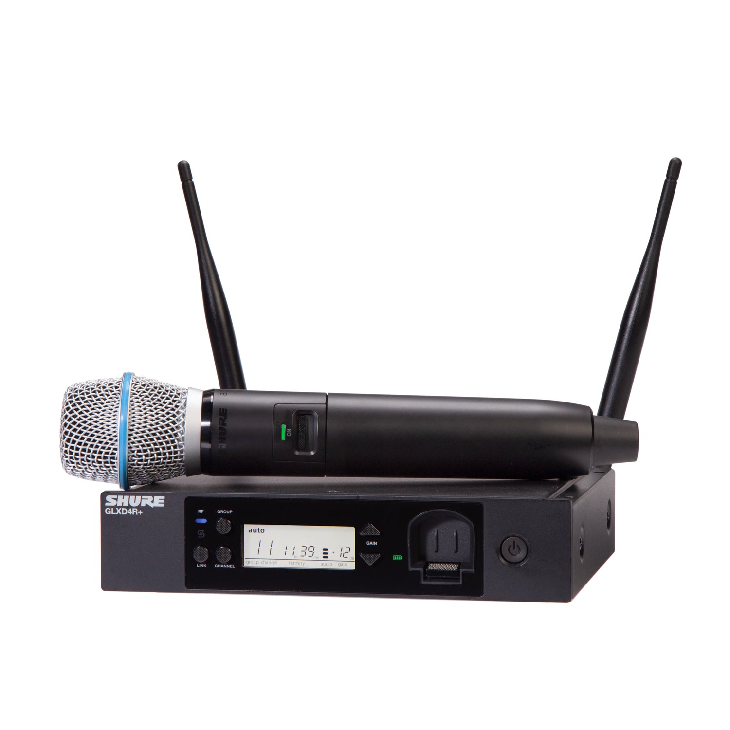 - El micrófono vocal del condensador Beta87A con transmisor incorporado y GLXD4R+ Half-rack recibe.