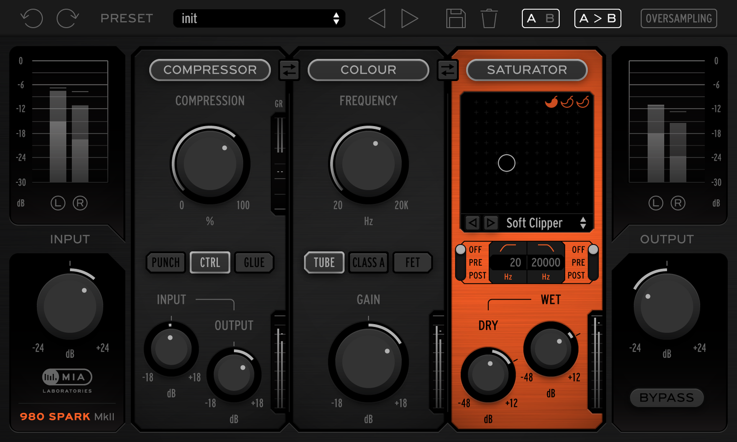 980 Spark MkII is an audio plugin that blends vintage preamp warmth with modern digital precision and flexibility. Engineered for quick, intuitive workflows in sound design and mastering, it delivers a unique saturation experience by simultaneously adjusting the spectral, dynamic, and harmonic content of your sound.