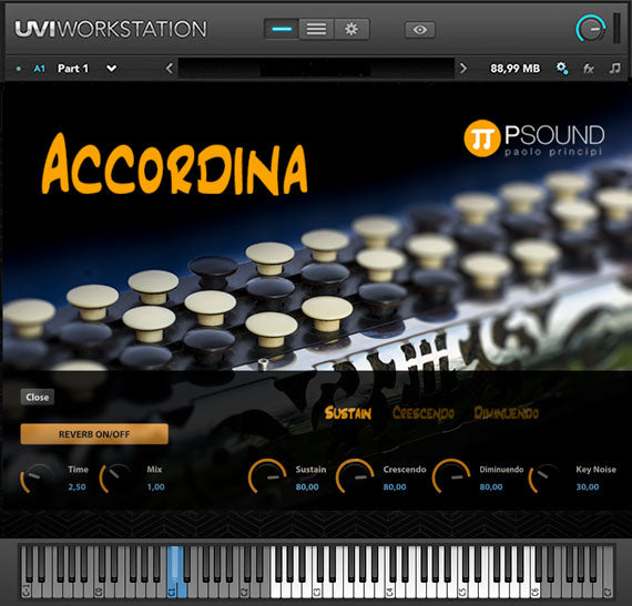 Accordina Accordina es un instrumento de lengüetas gratuito, similar a la armónica. Toma su teclado cromático (44 notas) del acordeón. PSound Accordina ha sido muestreado hasta 6 capas y 3 articulaciones para más de 400 muestras (300MB de almacenamiento).
