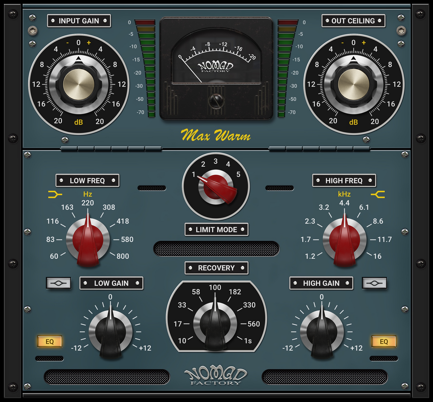 Internally, the AMT Max Warm uses a special processing algorithm to accurately maximize the incoming signal level while limiting the ceiling peak levels. This approach tends to produce a more natural warm-sound, the AMT Max Warm also includes a two-band equalizer (shelving/peaking) with adjustable frequencies, making this plug-in an amazing advanced and versatile tool.