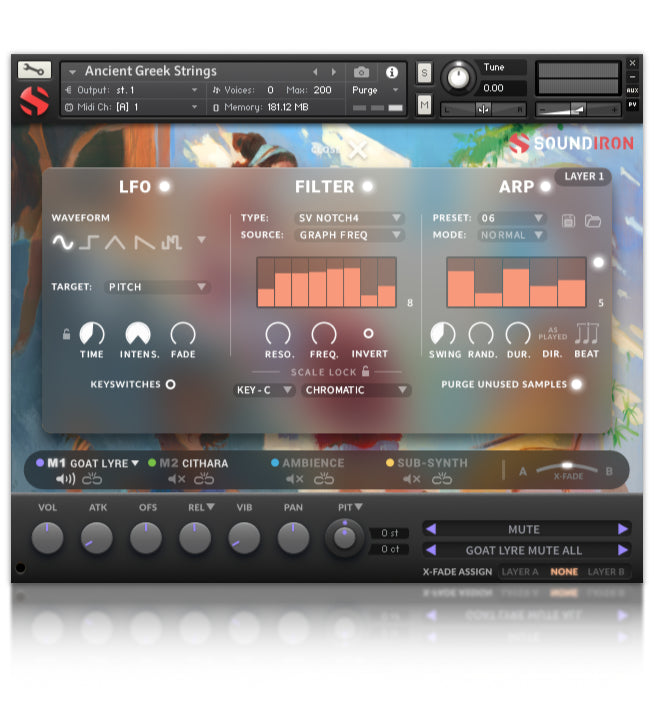 Ancient Greek Strings es una fantástica colección de 7 instrumentos de cuerda muestreados en profundidad que se adentran en las raíces históricas de las tradiciones musicales occidentales, que se remontan a miles de años. Esta biblioteca presenta un Barbiton, Cithara, Lira, Lira de cuerno de cabra, Pandura, Phorminx y Trigonon. Elaborados en madera, tripa y pieles de cabra, estos clásicos artefactos musicales capturan el sonido y el espíritu de la civilización griega clásica en su apogeo. La influencia que han tenido en las arpas, guitarras y cítaras modernas es claramente audible y evidente en estas fieles reconstrucciones. Cada pieza fue elaborada a mano por el maestro artesano Panagiotis Stefos de Lyr?vlos en Atenas. Stefos y su equipo tocaron cada instrumento, todos grabados con un detalle exquisito por el productor John Valasis, con 8 round-robins y 4 velocidades dinámicas por cuerda.
