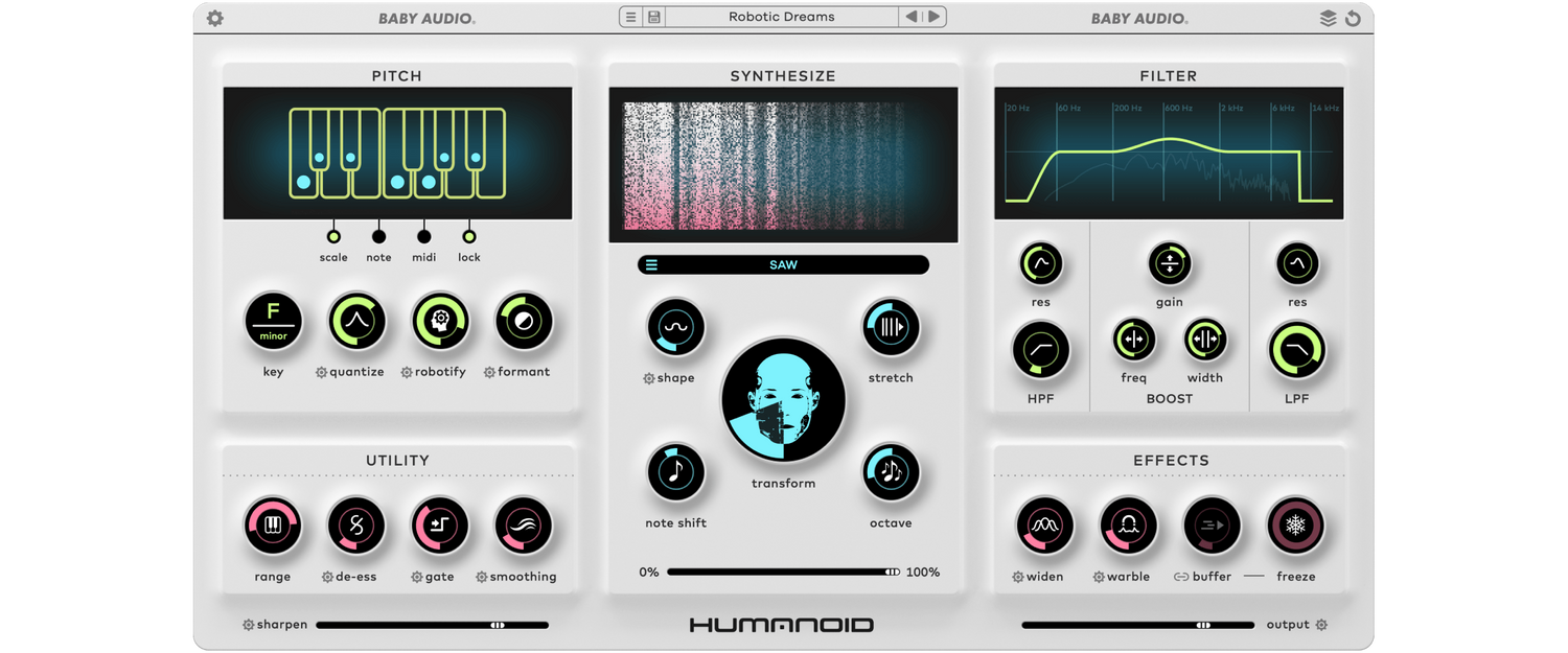 En su forma más extrema, Humanoid convertirá una voz completamente en un sintetizador, mientras que configuraciones moderadas añadirán un sutil brillo electrónico a la mezcla vocal.