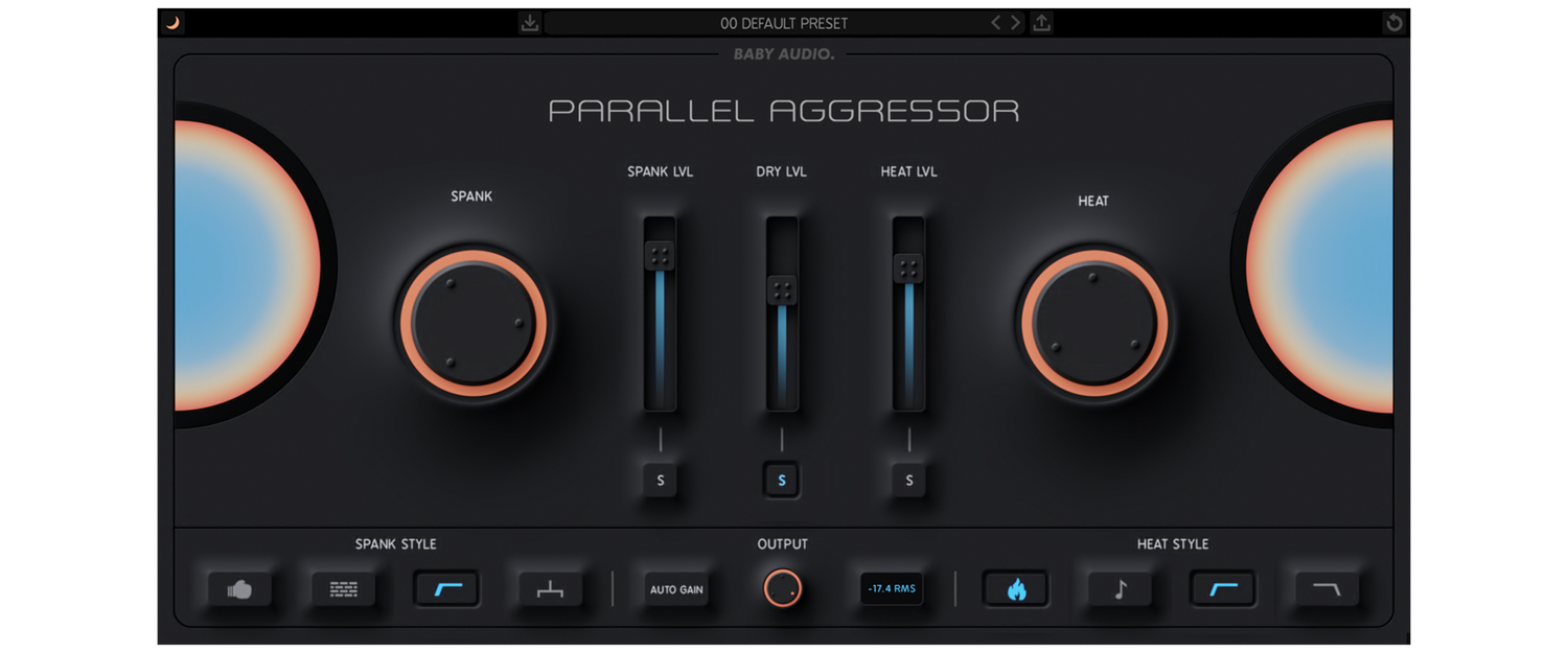 "Spank" ofrece un duplicado de tu pista original con una compresión intensa. "Heat" ofrece un duplicado con una saturación intensa. "Dry" es tu audio limpio. ¡Trabaja duro con los dos duplicados! Luego combina las tres señales para exprimir hasta la última gota de jugo sonoro de tu pista!