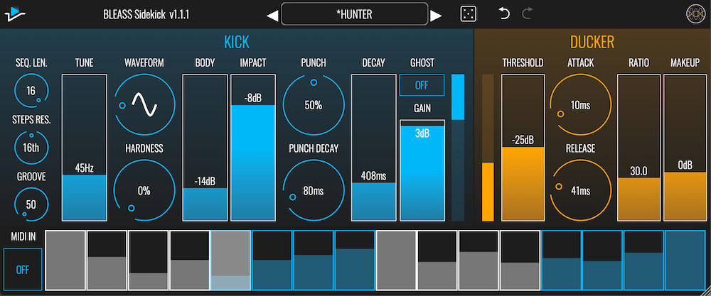BLEASS Sidekick es un plugin versátil que combina un sintetizador de bombo, un secuenciador de 16 pasos y un ducker para efectos dinámicos de sidechain. Su motor de bombo de estilo analógico, inspirado en cajas de ritmos vintage, crea bombos contundentes y resonantes que se pueden mezclar con la señal de entrada o enrutar a un canal de bus separado para un procesamiento adicional.
