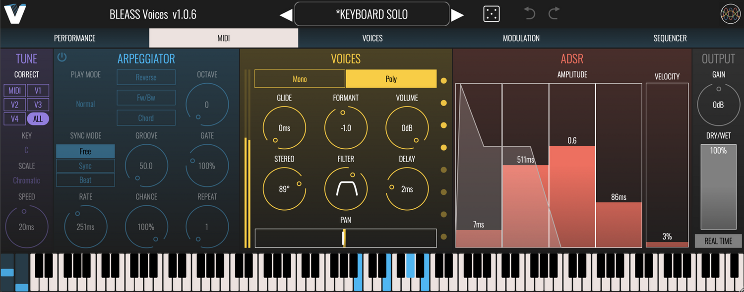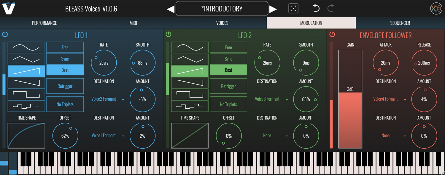 Cuatro voces pueden ser transpuestas de manera independiente por ±1 octava o aplanadas a un tono elegido, mientras que ocho son activadas por MIDI, coincidiendo con las notas entrantes. El profundo soporte de MPE permite acordes vocales expresivos y solos con deslizamientos y trinos realistas. Los moduladores al estilo de sintetizador, que incluyen dos LFOs, un seguidor de envolvente y un secuenciador de patrones, añaden variación dinámica.