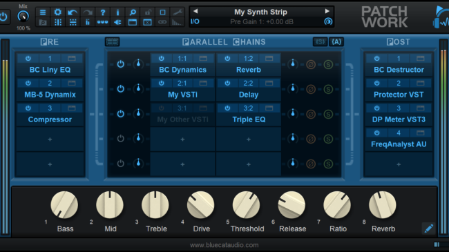 Blue Cat's PatchWork es un patchbay universal de plug-ins y multi FX que puede hospedar hasta 64 plug-ins VST, VST3, Audio Unit o plug-ins integrados en cualquier Estación de Trabajo de Audio Digital (DAW) en una sola instancia, con opciones de enrutamiento tanto en serie como en paralelo.