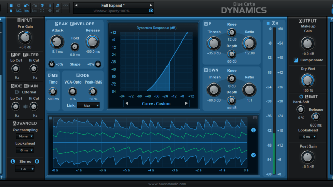 Blue Cat's Dynamics es un procesador de dinámica completo: ¡puede usarse como compresor, limitador, puerta, expansor, modelador de ondas, o todo a la vez! La respuesta dinámica del plug-in se puede ajustar con un sistema único de dos umbrales y proporciona retroalimentación visual detallada sobre su comportamiento.