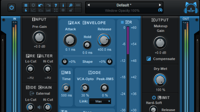 - Total control over the processor: continuous peak/RMS and Opto/VCA modes selection, peak envelope shape control, depth control to limit the gain range, lookahead.