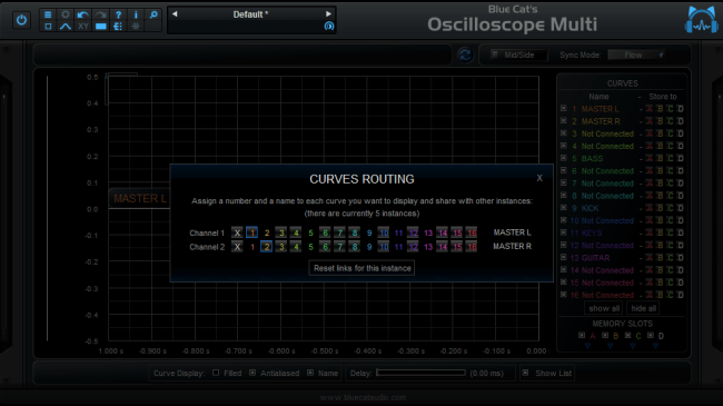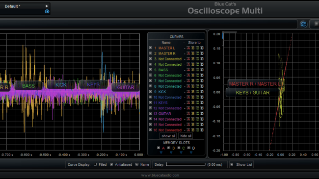 Blue Cat's Oscilloscope Multi es un renderizador y comparador de formas de onda en tiempo real único para múltiples pistas: te permite visualizar el contenido de varias pistas de audio en la misma pantalla y compararlas gracias a su vista X-Y.