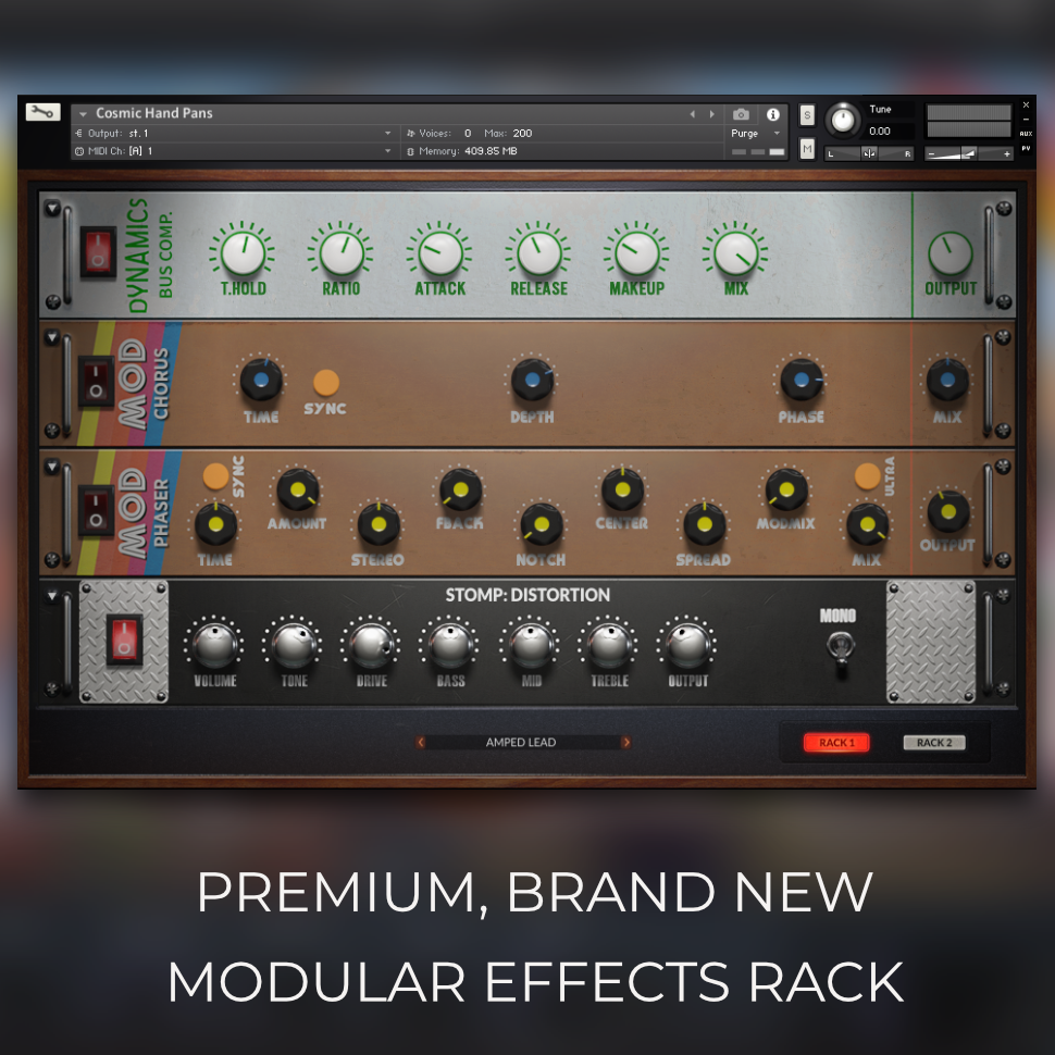 La interfaz se completa con nuestro panel de rack FX modular, con 27 diferentes módulos de efectos DSP que puedes asignar en cualquiera de los 8 slots disponibles, en el orden que desees. Encontrarás phaser, flanger, delay, distorsión, simuladores de amplificadores y cabinas, compresores, EQ, rotador y mucho más. El efecto de Reverb incluye nuestras respuestas de impulso de reverb de convolución favoritas, incluyendo 99 diferentes habitaciones, salones, cámaras y entornos al aire libre, además de otros 40 impulsos FX personalizados para transformar radicalmente el sonido y abrir nuevos mundos de posibilidades musicales. ¡Hemos añadido un gran banco de presets de fábrica de cadena de rack FX para que empieces!