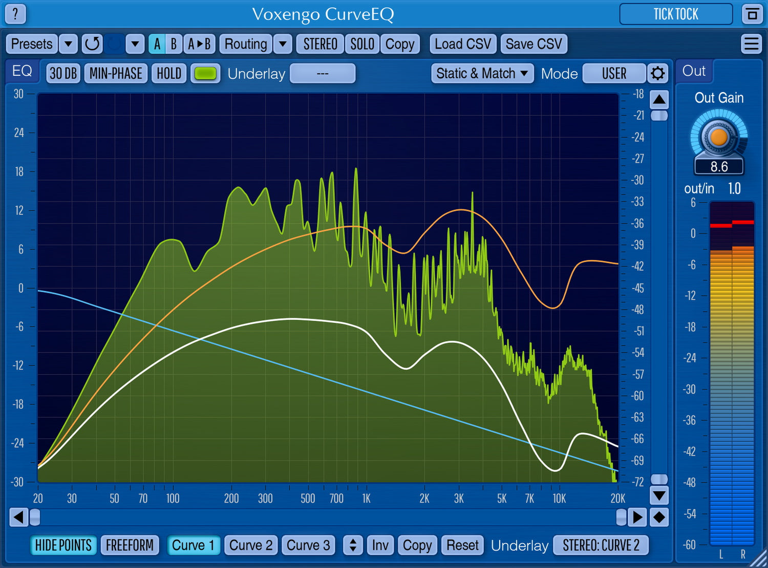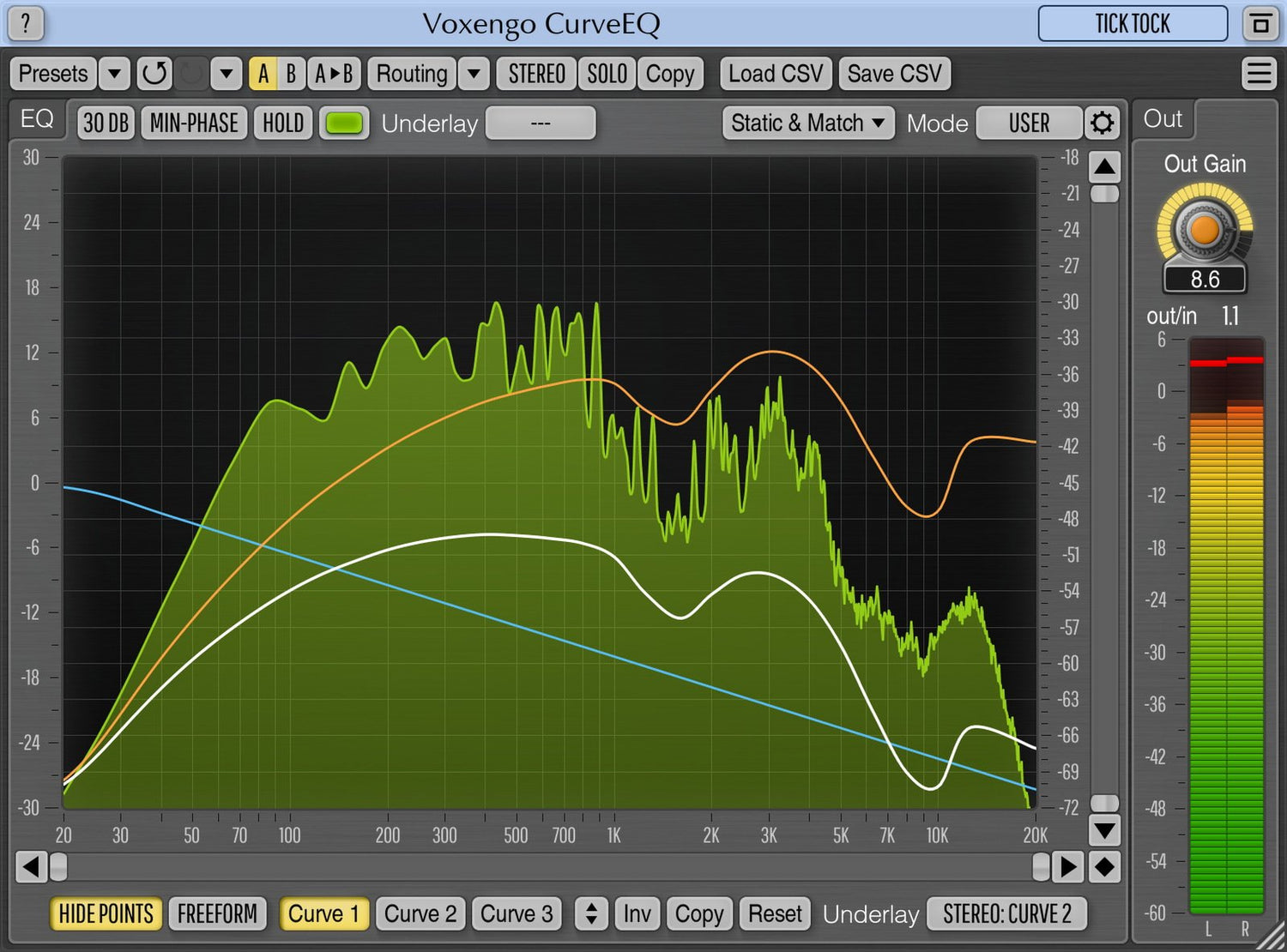 CurveEQ’s filters can be switched between linear- and minimum-phase modes. CurveEQ also features a deeply-customizable spectrum analyzer like the one found in Voxengo GlissEQ and SPAN plug-ins. You may also display, save and load static spectrum plots for comparison and matching purposes.