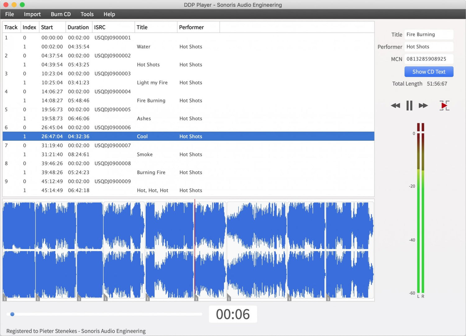 The DDP Player can import (loadback) a DDP 2.00 fileset made by any software, like Bias Peak Studio (XT), Sonic Studio HD, SADiE, Sequoia or Pyramix. You can playback tracks, audition gaps, see all PQ codes, ISRC, MCN and CD-Text data. Another feature is the Check Project function that tests the imported project against a set of RedBook specification rules.