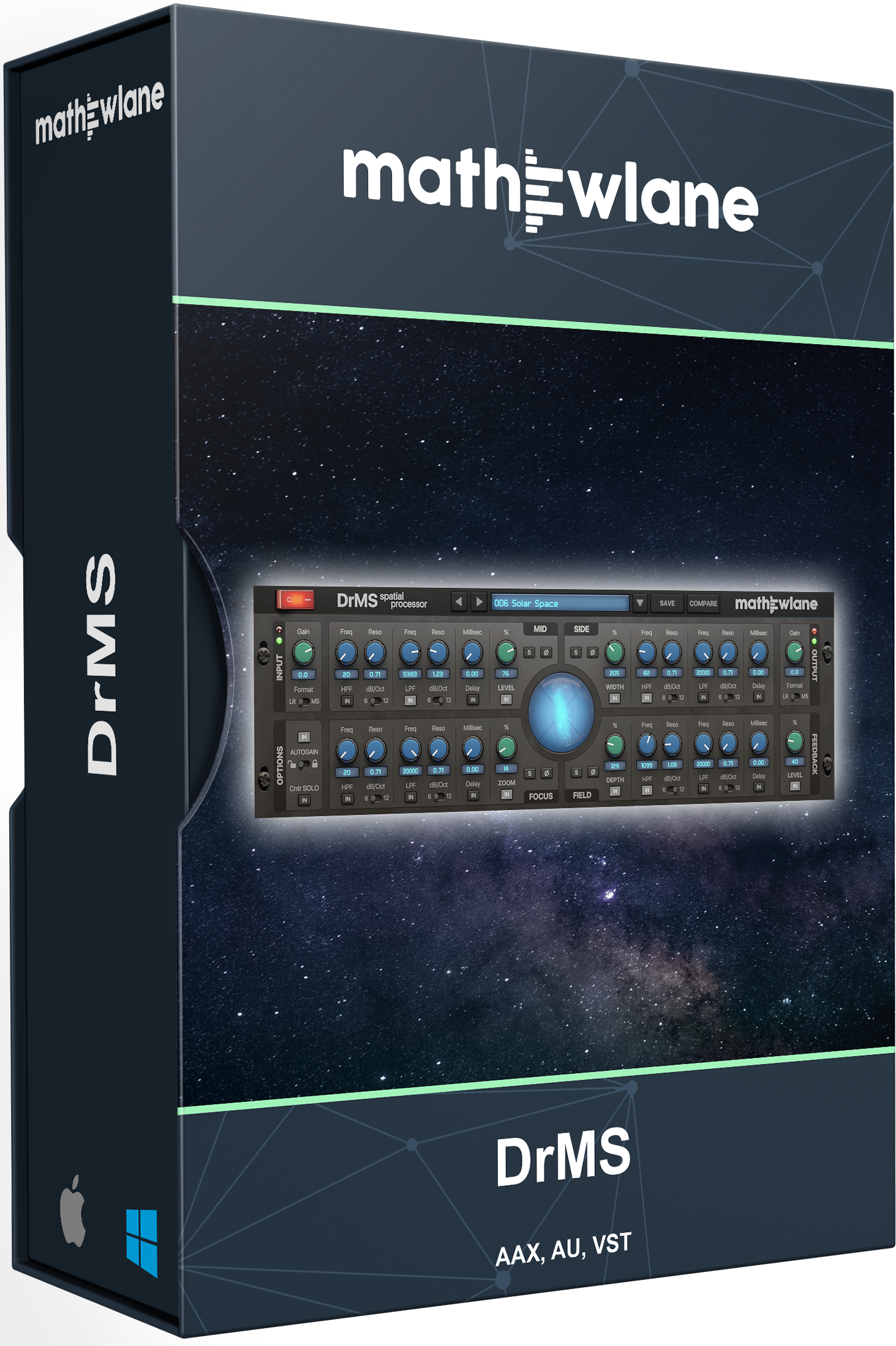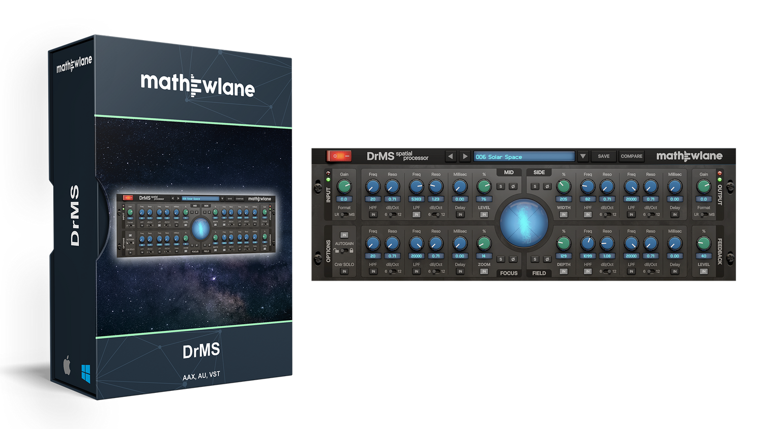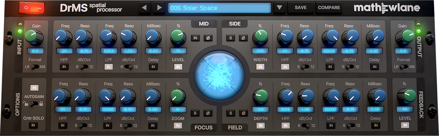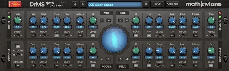 DrMS es un procesador espacial único, disponible como plugin AAX/AU/VST/VST3, con una amplia gama de aplicaciones para mixing, mastering y postproducción: desde la simple codificación/decodificación MS (Mid-Side), pasando por la mejora de la anchura y la profundidad del campo estéreo, hasta la resolución de problemas de compatibilidad mono y mucho más.