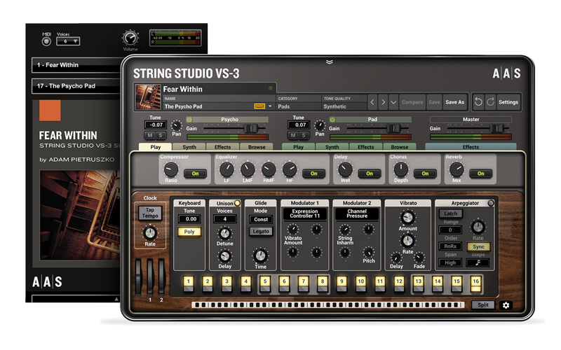 Resident sound designer Adam Pietruszko unleashes Fear Within—a collection of 100 presets stretching the soundscape limits of String Studio VS-3. Fear Within tingles your spine with the whole gamut of uneasy ambiances, grisly melodic keys, immersive pads, suspenseful percussions, and downright creepy noises. The masterfully crafted modulator effects widen the scope of this obsessively detailed sound pack by multiplying the sonic reach of each sound.