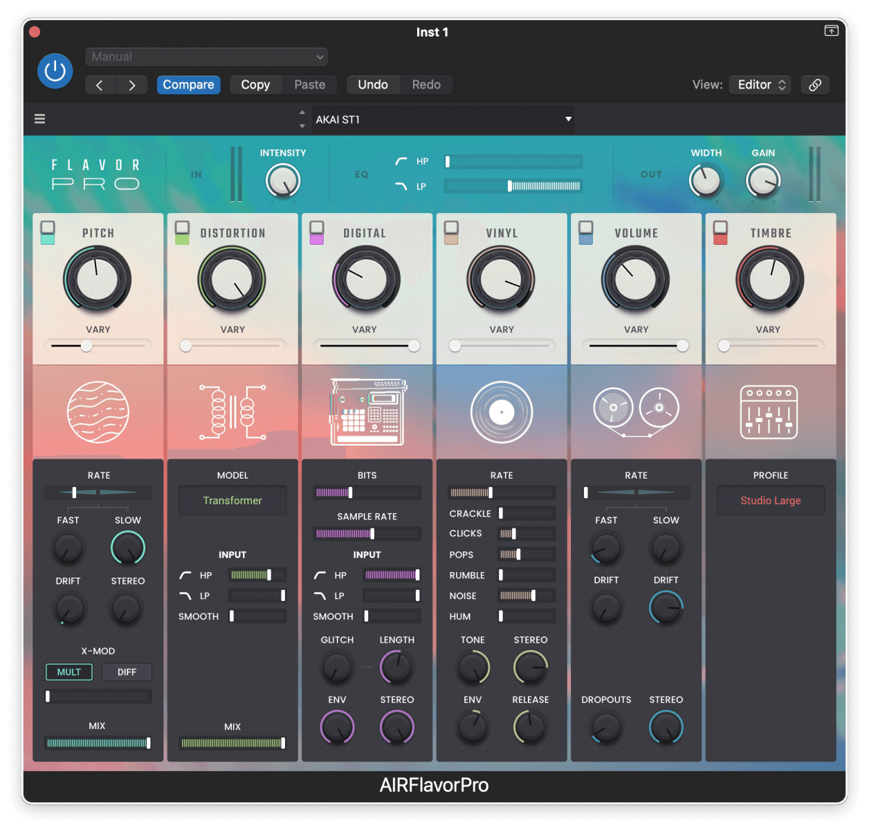 Recreate the iconic lo-fi sound of vintage and classic old-school Akai MPC and S Series Samplers to VHS and cassette tapes. With dedicated bit crushing and sample rate reduction controls to color your sound. Also includes HP/LP Filter, Smooth, Glitch, Length, Envelope, Stereo and Vary Controls. The Flavor never stops!