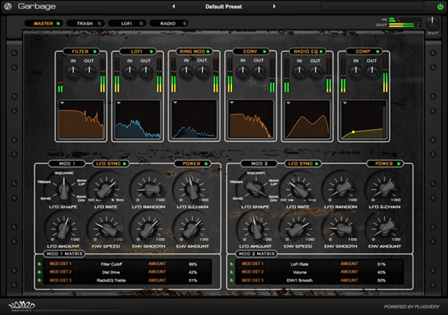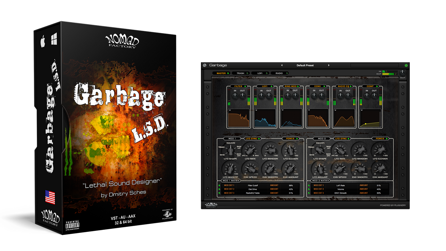 GARBAGE LSD is a mind-bending audio transformation plug-in with user adjustable signal chain and dual modulation matrix. It provides a series of lethal modules to manipulate, distort, destroy and transform your sounds with radioactive modulation, junk EQs, warping convolutions and scummy filtering to name a few.
