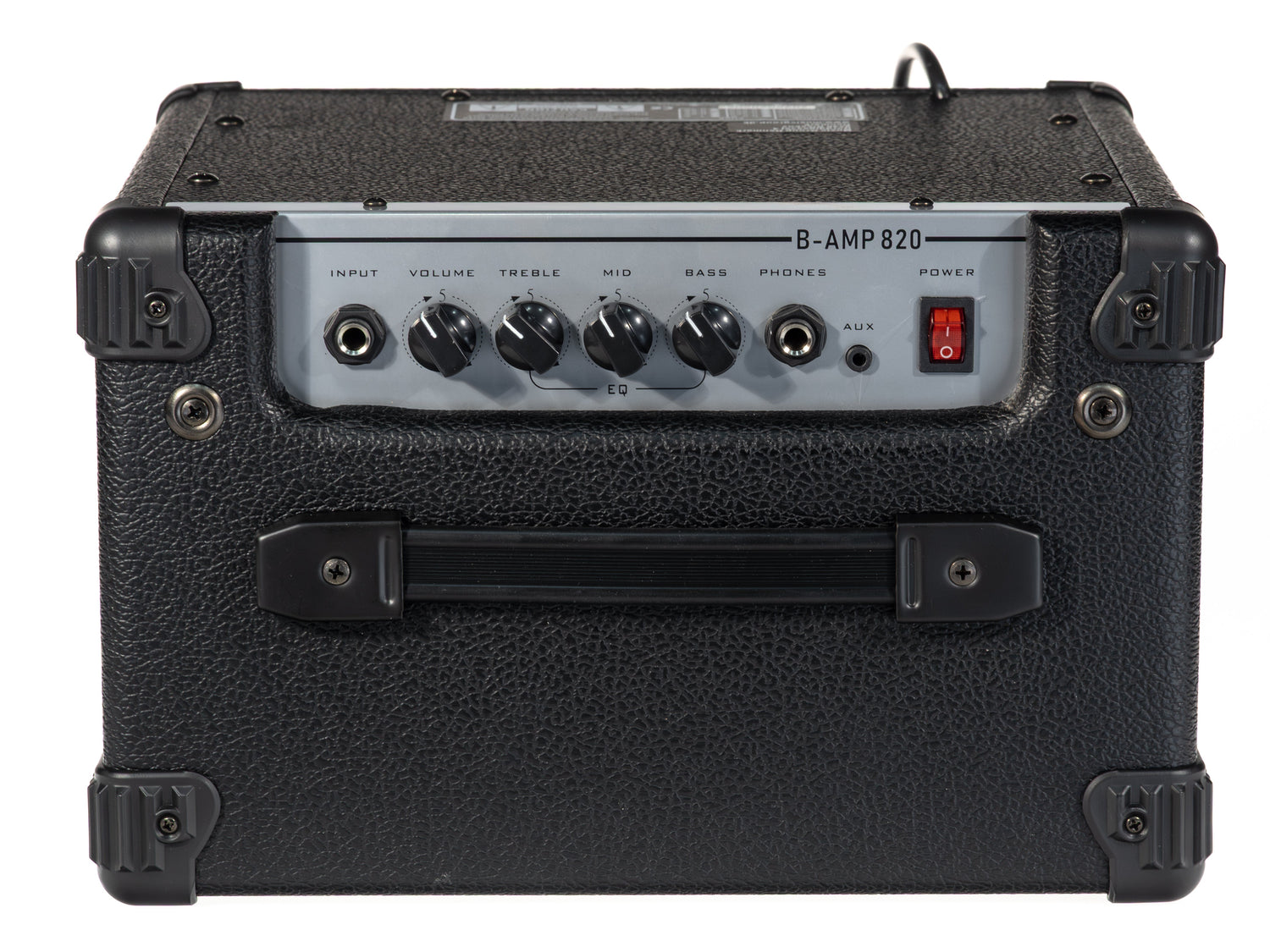 The amplifier is equipped with a 3-band EQ, allowing you to easily shape your sound according to your playing style. Connect your music via the AUX input and play along with your favorite tracks, or use the headphone output for quiet practice sessions without disturbing the surroundings.