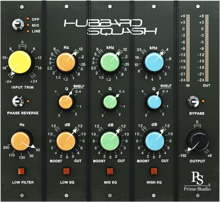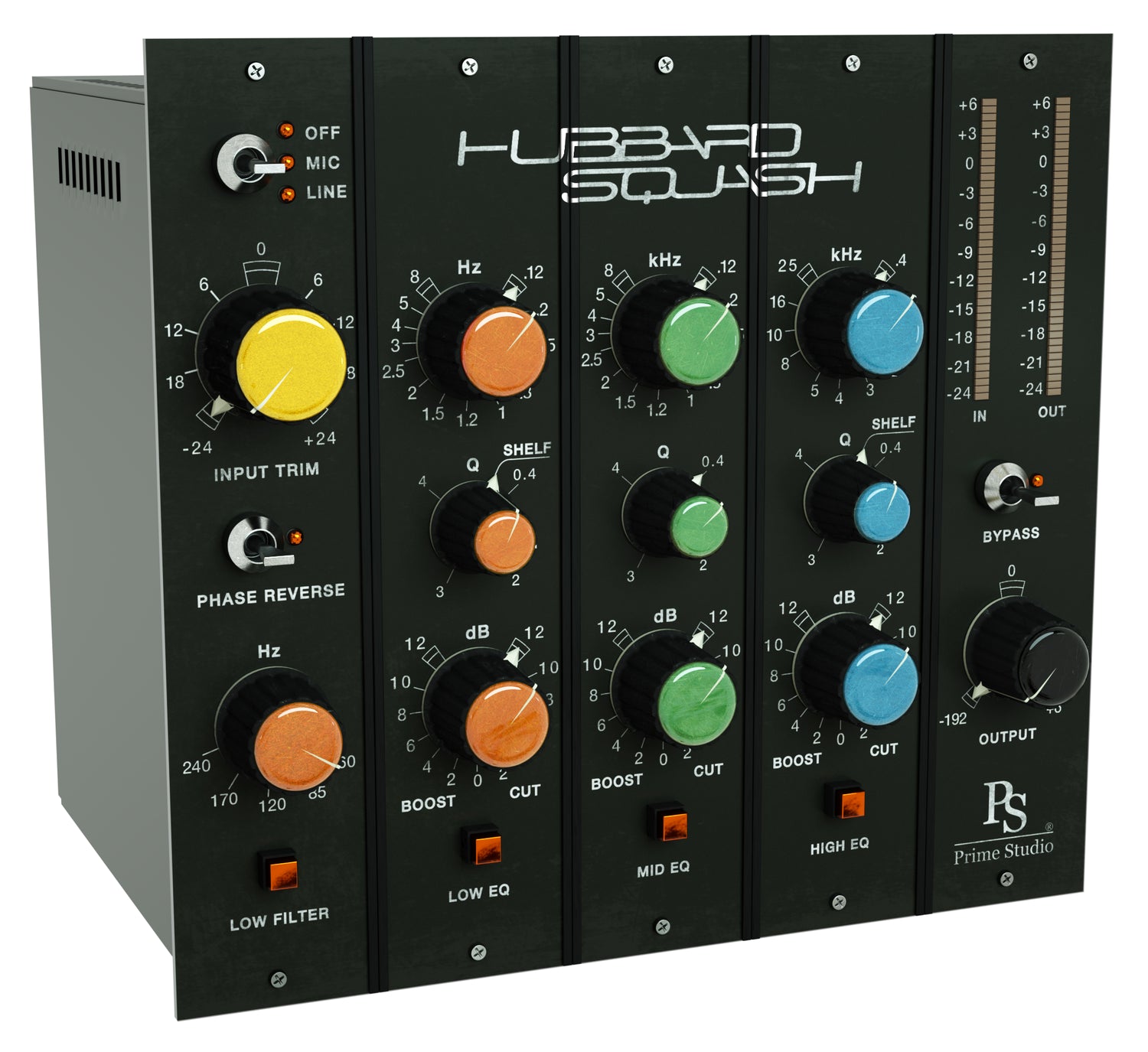 Prime Studio® Hubbard SquashSmooth, más suave, Hubbard Squash. Ecualizador estéreo totalmente paramétrico de tres bandas clásico que ofrece un tono exuberante para bandas de frecuencia baja, media y alta que se pueden activar por separado y un filtro de corte bajo.