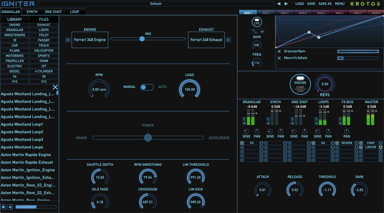 Igniter is the only solution of its kind to come jam-packed with over 20 performable vehicles and 614 audio assets from vehicles including Aston Martin, Ferrari, Porsche, Tesla, Harley Davidson, Huey UH-1H, Agusta Westland 119x, CH-47D Chinook, Bombardier Challenger, Cessna 560XL, skids, sweeteners and much more. Recordings come from Watson Wu, The Recordist, Sounding Sweet, George Vlad, Echo Peak and Flysound.