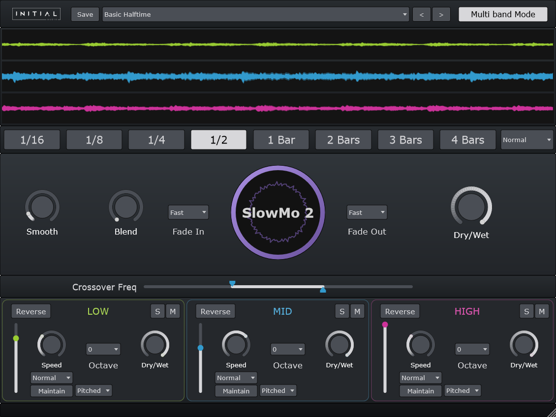 Los controles globales clave incluyen Smooth para un procesamiento sin artefactos, Blend para mezclar el audio original como un porcentaje del tiempo de bucle (valores bajos preservan transitorios, valores altos crean un parpadeo rítmico en bucles cortos como 1/4), Fade In/Out con opciones rápidas/lentas para transiciones sin costuras (desvaneciendo el original mientras se desvanece la versión ralentizada), y Dry/Wet general para mezclar. Reverse reproduce el audio hacia atrás pero solo se activa después de que se llena un búfer de bucle completo. En modo multibanda, frecuencias de cruce ajustables (inicio y fin) dividen la señal: baja por debajo de la frecuencia de inicio, alta por encima de la frecuencia de fin, media entre ambas, con solo/silencio por banda para edición.