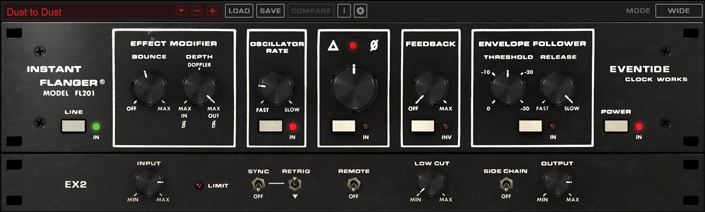 - Three distinct flavors of flanging. Set the Mode switch for Shallow, Deep or Wide