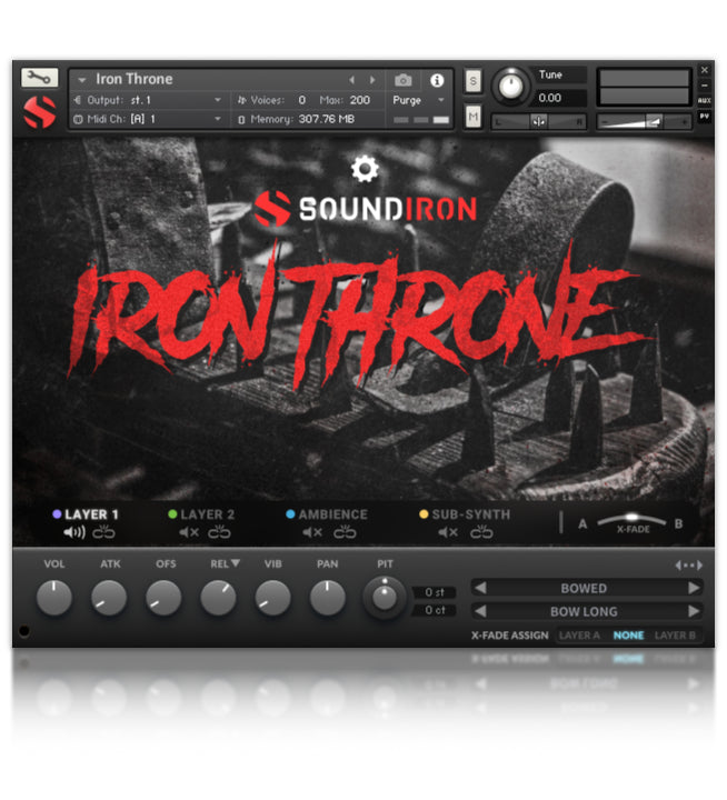 Utilizamos arcos de viola en los bordes del trono para crear tonos melódicos y disonantes inquietantes. Se incluyen varios tipos de conjuntos de instrumentos frotados, incluyendo sostenidos largos, efectos de glissando medios, staccato corto, spiccato y sostenidos de tremolo. Hay una serie de diferentes frotaciones de mazo, cepillo, dedo y efectos de peine para explorar. Las arrastradas de dedo, la pelota de goma y las frotaciones de mazo plano se crearon arrastrando el borde de los mazos (o dedos) a lo largo de las superficies del trono, en arcos y líneas largas. Esto provocó que resonara de manera similar a un gong frotado. Los golpes de mazo se produjeron con mazos y palos de madera, fieltro y punta de metal para producir conjuntos de percusión metálica estándar. Para Iron Throne 2.0, creamos nuevas ambiencias, drones y pads atmosféricos a partir de las grabaciones de origen crudo. Esta biblioteca también contiene 20 nuevos presets FX personalizados para darte inspiración instantánea para tu próxima puntuación de película/videojuego, banda sonora o composición musical.