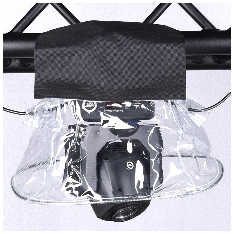 Rain cover for stage lighting Light4Me RC1 is a professional stage lighting cover that protects equipment from rain on openair stages, but also from the scorching sun or falling leaves. The cover is made of waterproof synthetic fabric and transparent soft polyethylene forming a shade. With the excellent sliding properties of both materials, low abrasion, as well as weather resistance and excellent electrical insulation properties, the Light4Me RC1 rain cover guarantees the highest level of protection for stage lighting. Professional protection on every stage The Light4Me RC1 stage lighting cover is designed so that you can easily put it on and take it off without removing the mounting clamp. Its also lightweight and folds down to a compact size, so it takes up little space during transport and storage. Its a great solution for mobile stages, amphitheaters, concert shells and all event companies dealing with lighting fixtures at various types of events. Intended for LED PAR stage spotlights mini moving heads small stage effects lasers and projectors Technical specification Material synthetic fabric, polyethylene, steel Color black, transparent Shade diameter 43 cm Height 2317 cm frontback Clamp hole 1 Cable holes 2 Weight 0.6 kg Original packaging and filling.