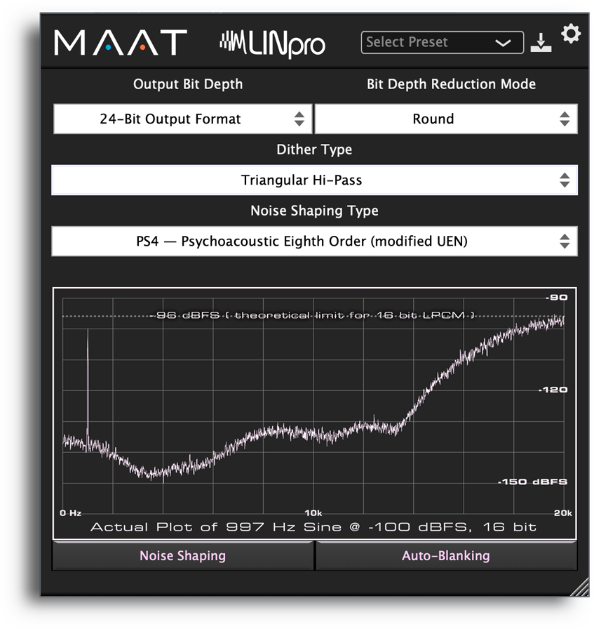 Compartiendo la misma interfaz de usuario, la familia LIN de MAAT, de dos canales y multicanal, es tu enlace final entre la producción y la entrega. Ofreciendo reducción opcional de longitud de palabra y siete espectros de modelado de ruido adaptados tanto para la entrega analógica como digital de activos, LIN es altamente ajustable para ayudar a crear tu propio “sonido” característico. Además de TPD y TPD ponderado, LINpro y LINSurround cuentan con cuatro nuevas opciones de modelado de ruido psicoacústico de quinto, octavo y noveno orden. Al igual que con todos los mecanismos de dithering, LIN debe ser la última instancia de plug-in, justo antes de convertir al formato final de punto fijo.