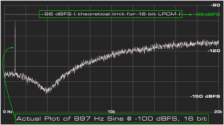 LINpro aporta certeza visual al arte arcano del dithering. Hemos incluido gráficos del mundo real de cada forma de ruido para tu placer visual. Estos no son simulaciones de MATLAB, son gráficos reales generados por el motor de dithering optimizado de LINpro. Observa que la señal de entrada de -100dBFS, ese pico en el lado izquierdo del gráfico, se preserva a pesar de que la longitud de palabra se ha reducido a 16 bits. Una palabra de 16 bits solo puede codificar o almacenar 96dB de rango dinámico. Cualquier información más silenciosa que -96dBFS debería perderse al reducir la longitud de palabra a 16 bits. Con LIN, hasta el 19º bit de la señal de entrada se preserva, incrustado en la palabra de 16 bits resultante.