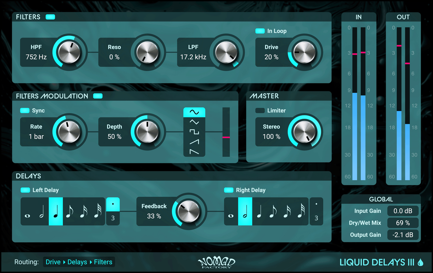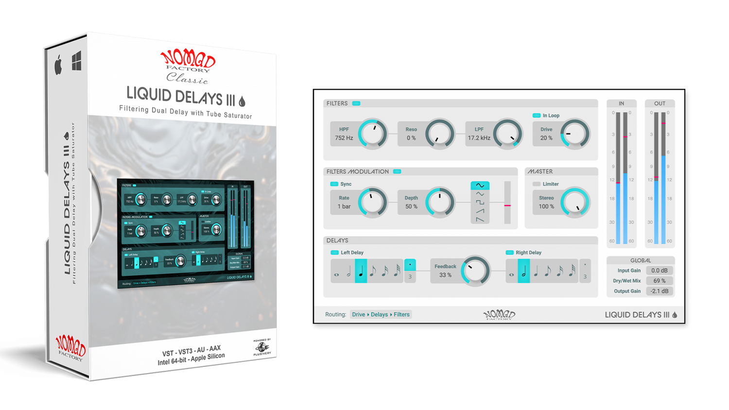 Liquid Delays III recreates the lush echoes and rhythmic repeats that defined countless classic recordings. Designed to emulate the warmth of vintage delay units, it brings rich, analog-inspired ambience to your tracks with effortless control.