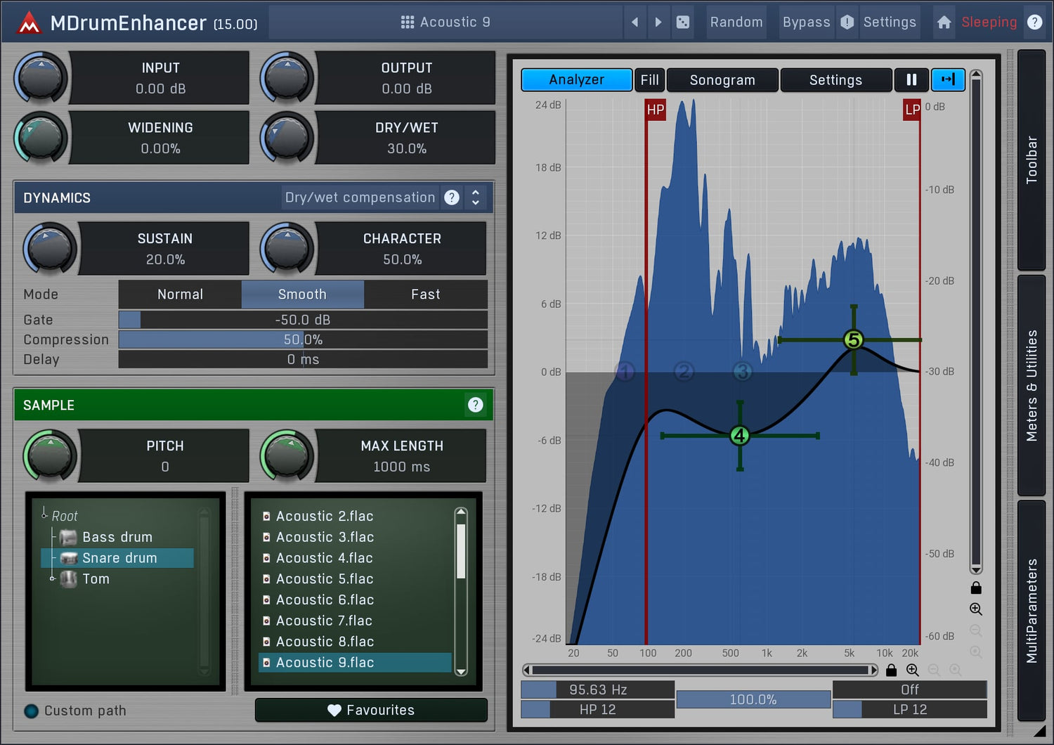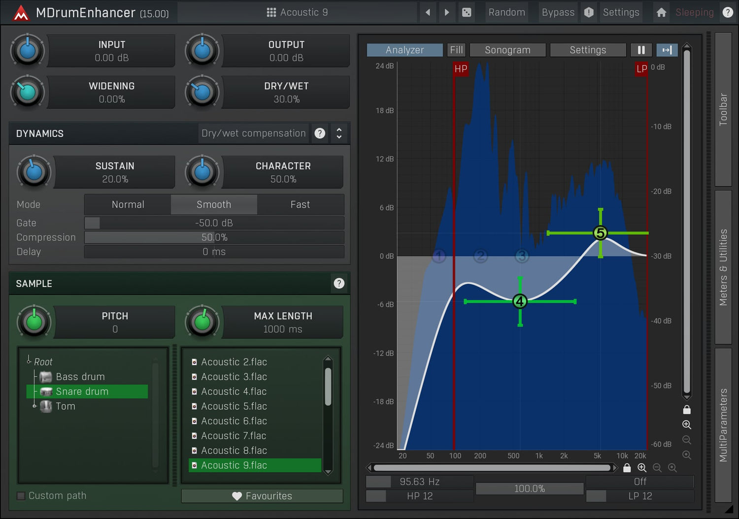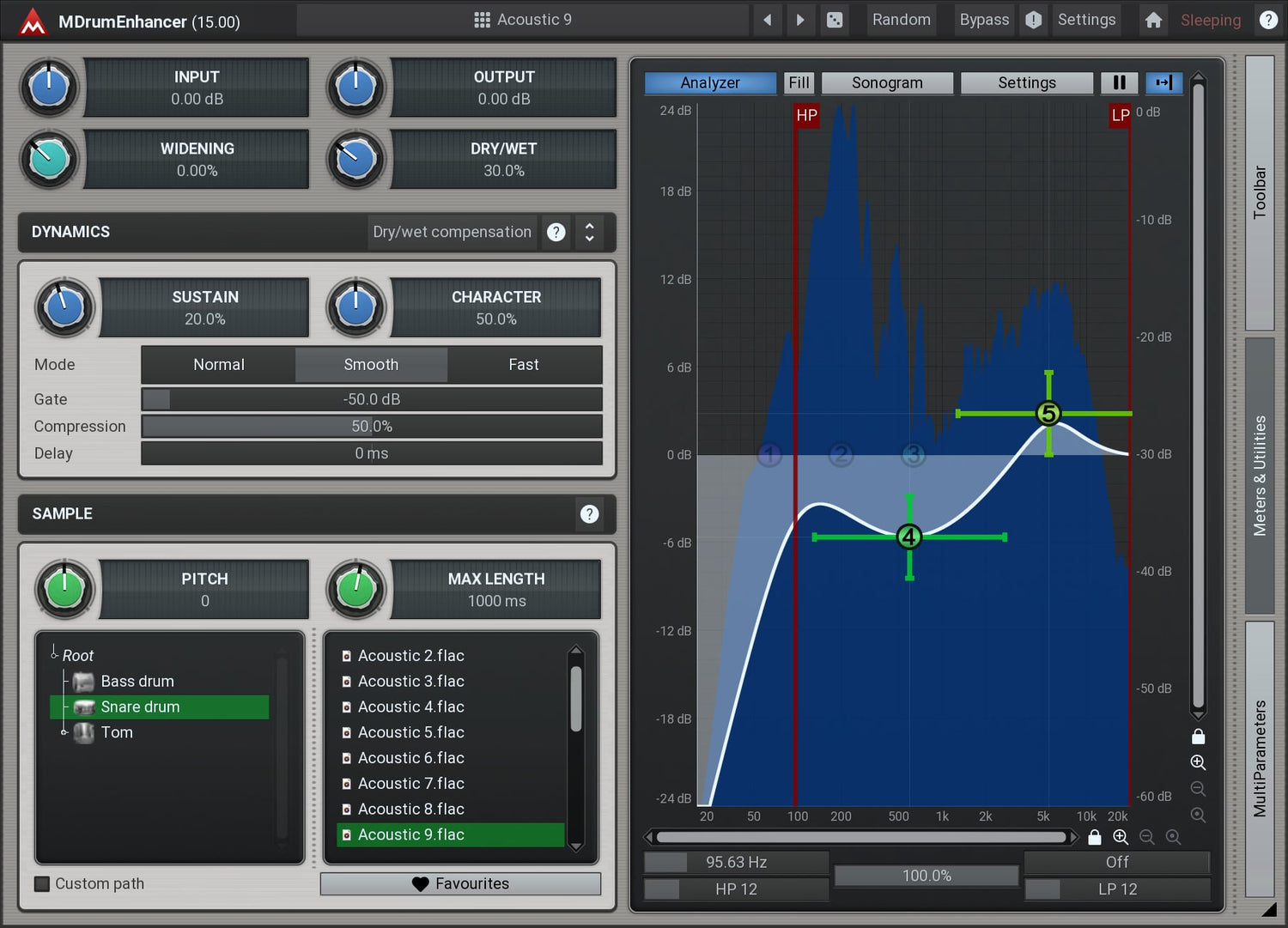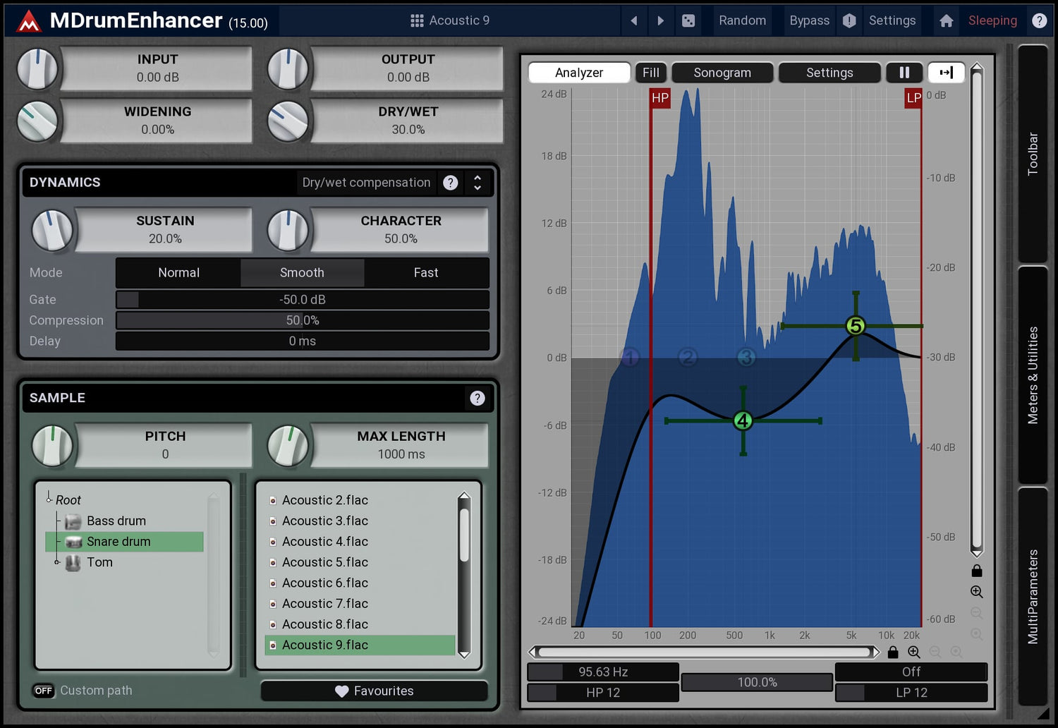 MDrumEnhancer is a unique tool that follows your drum track and synthesizes it's own signal using samples to make it sound big and phat, without any problems drum replacing suffers from. Add snare noises, improve bass drum's boom or snap, or even resynthesize the sound completely.