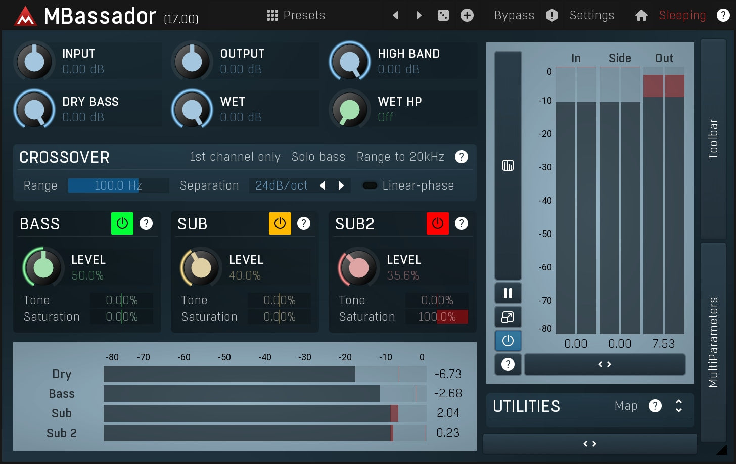No muchas personas tienen acceso al equipo de estudio que usamos al mezclar. Esto es especialmente cierto cuando se trata de reproducir el espectro de graves y subgraves. El primer módulo en MBassador te permite procesar el contenido de graves para que sea estable y ajustado y contenga armónicos más altos, de modo que sea audible incluso cuando se reproduce en un par de auriculares baratos que muchos oyentes utilizan hoy en día.