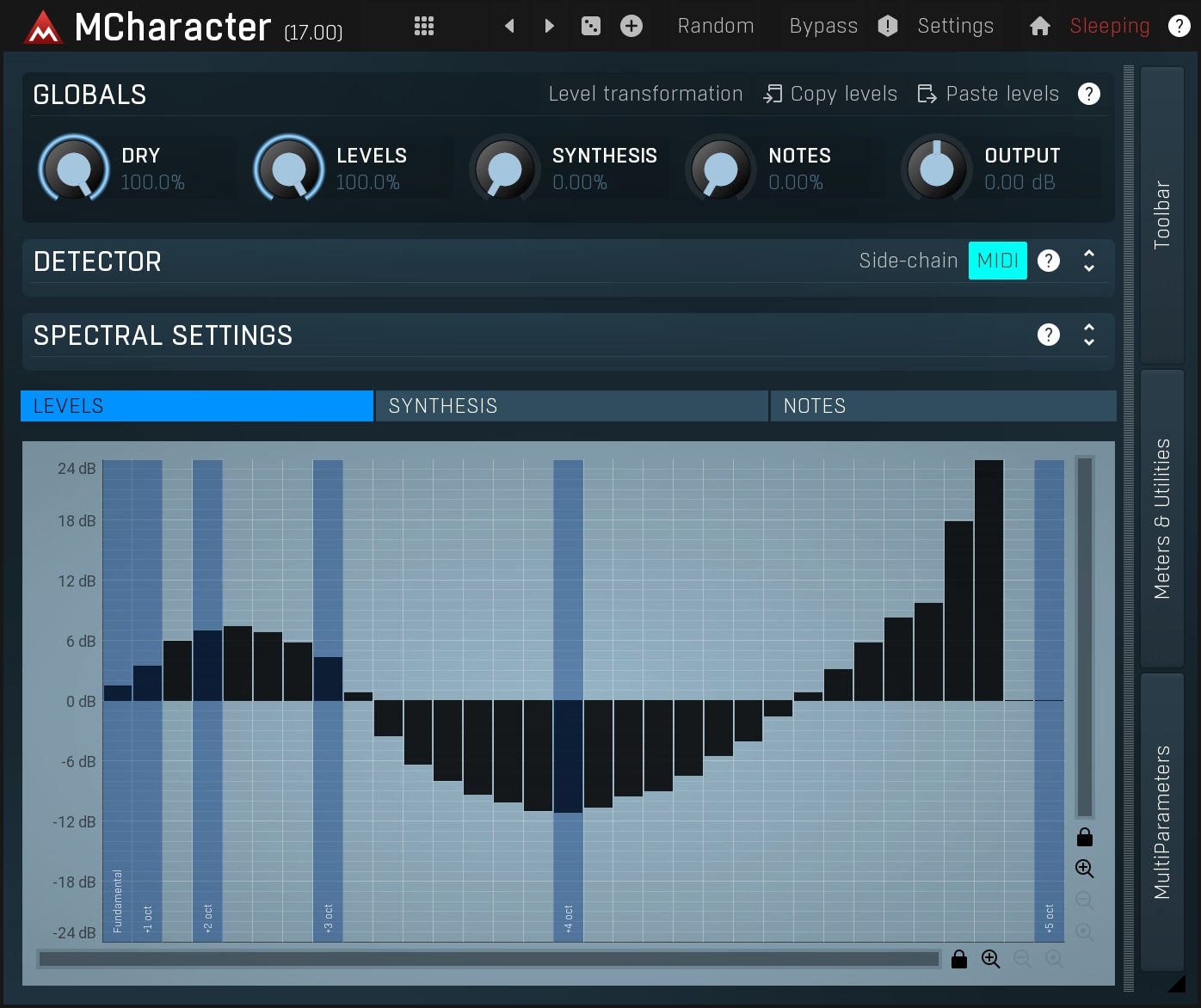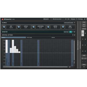 La mayoría de los instrumentos de audio tienen un carácter distintivo definido por armónicos y formantes. Los formantes son bastante estáticos en el espectro de audio, por lo que puedes cambiarlos directamente con un equalizer. Sin embargo, los armónicos son más problemáticos, porque siguen la tonalidad. MCharacter te permite controlar los niveles de los primeros 32 armónicos de una manera muy simple y efectiva. Al trabajar directamente en el dominio espectral, la capacidad del plugin para detectar la tonalidad es excepcional y los cambios son instantáneos, lo que hace que supere a los equalizers tradicionales en casi todos los aspectos.
