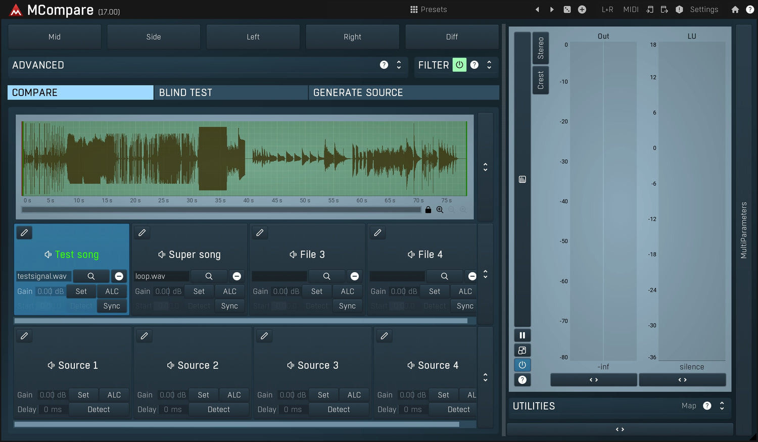 MCompare te permite comparar tu master con múltiples etapas en tu cadena, la mezcla seca para empezar. Compensará cualquier latencia y ajustará el volumen, así que realmente estarás comparando las cualidades sonoras de tu master y tus oídos no podrán engañarte. Así que cuando empieces a hacer algo mal, lo sabrás lo suficientemente rápido, con un solo clic, para ser precisos.
