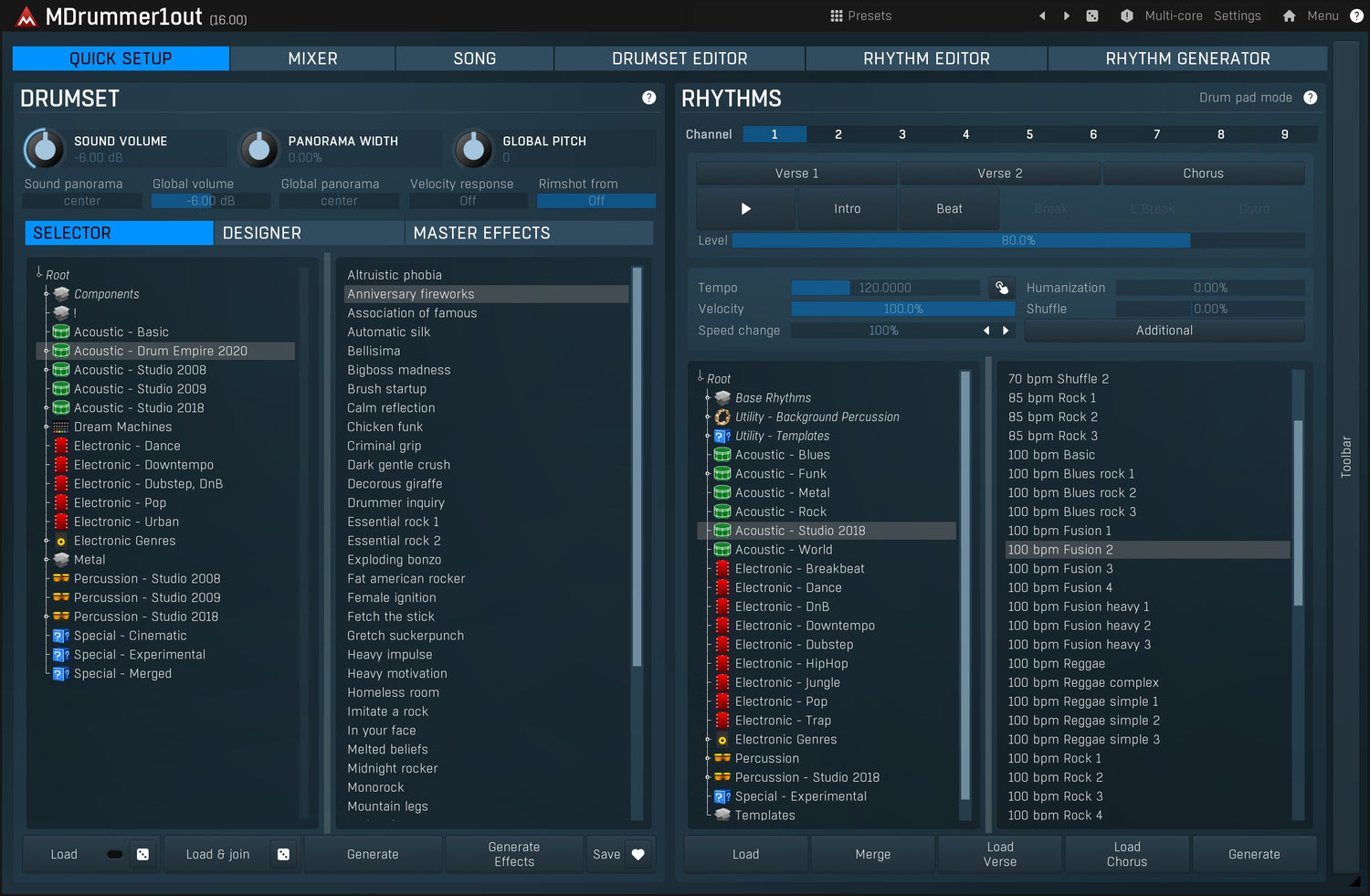 MDrummer puede generar un número infinito de nuevos kits de batería con solo presionar un botón, analizar e importar tus bibliotecas de muestras, fusionar múltiples kits de batería y mucho más. MDrummer es perfecto ya sea que busques un estilo tradicional, un sonido verdaderamente único disponible con unos pocos clics, o si estás listo para ensuciarte y explorar las profundidades de la máquina de ritmos más avanzada del mundo.