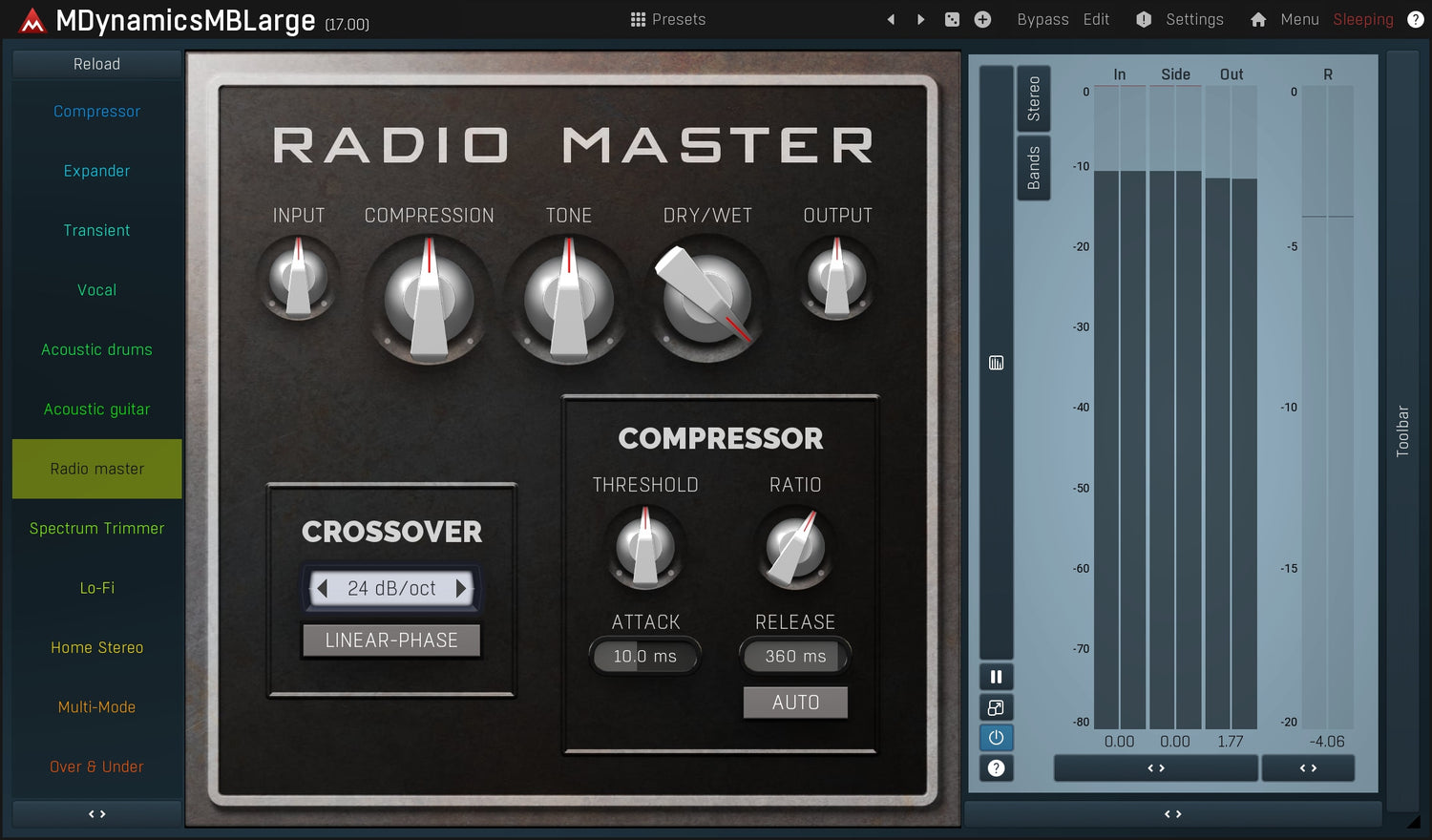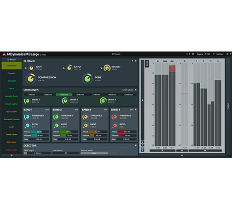 MDynamicsMB puede dividir la entrada en 6 bandas de frecuencia separadas, proporcionando cruces analógicos con hasta 120dB/octava de separación, cruces de fase lineal y cruces híbridos. Lo que hagas con cada una de estas bandas depende de ti.