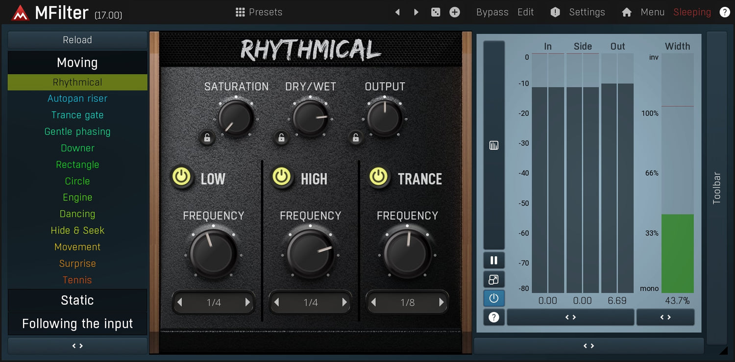 Siempre que necesites añadir algo de movimiento a un sonido que de otro modo sería estático, un filtro es uno de los primeros procesadores que debes probar. MFilter probablemente puede hacer más de lo que podrías imaginar que un filtro sería capaz de hacer.
