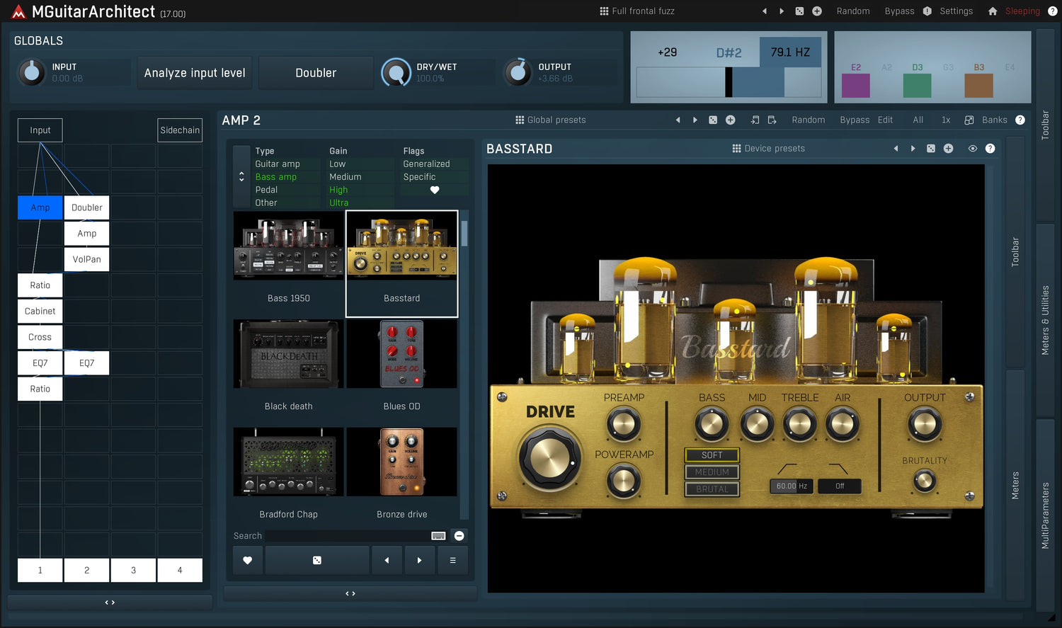 La interfaz de entrada de MGuitarArchitect tiene tres cadenas completamente personalizables con 16 espacios cada una, así como una cuarta para sidechaining. Esto significa que puedes ejecutar hasta 64 efectos en orden o en paralelo a través de los cuatro grupos diferentes. Cuando haces clic en uno de los espacios libres, obtienes la opción de elegir entre efectos de guitarra, stomps, estudio y utilitarios. Todos están organizados por categoría, así que tienes acceso rápido a cualquier sonido que desees.