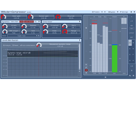 MModernCompressor, por supuesto, proporciona los parámetros de control típicos, reducción de ganancia, picos de salida y valores de sonoridad, pero también muestra un gráfico de distribución de niveles, del cual el plugin puede analizar la señal y configurar automáticamente los parámetros del compresor.