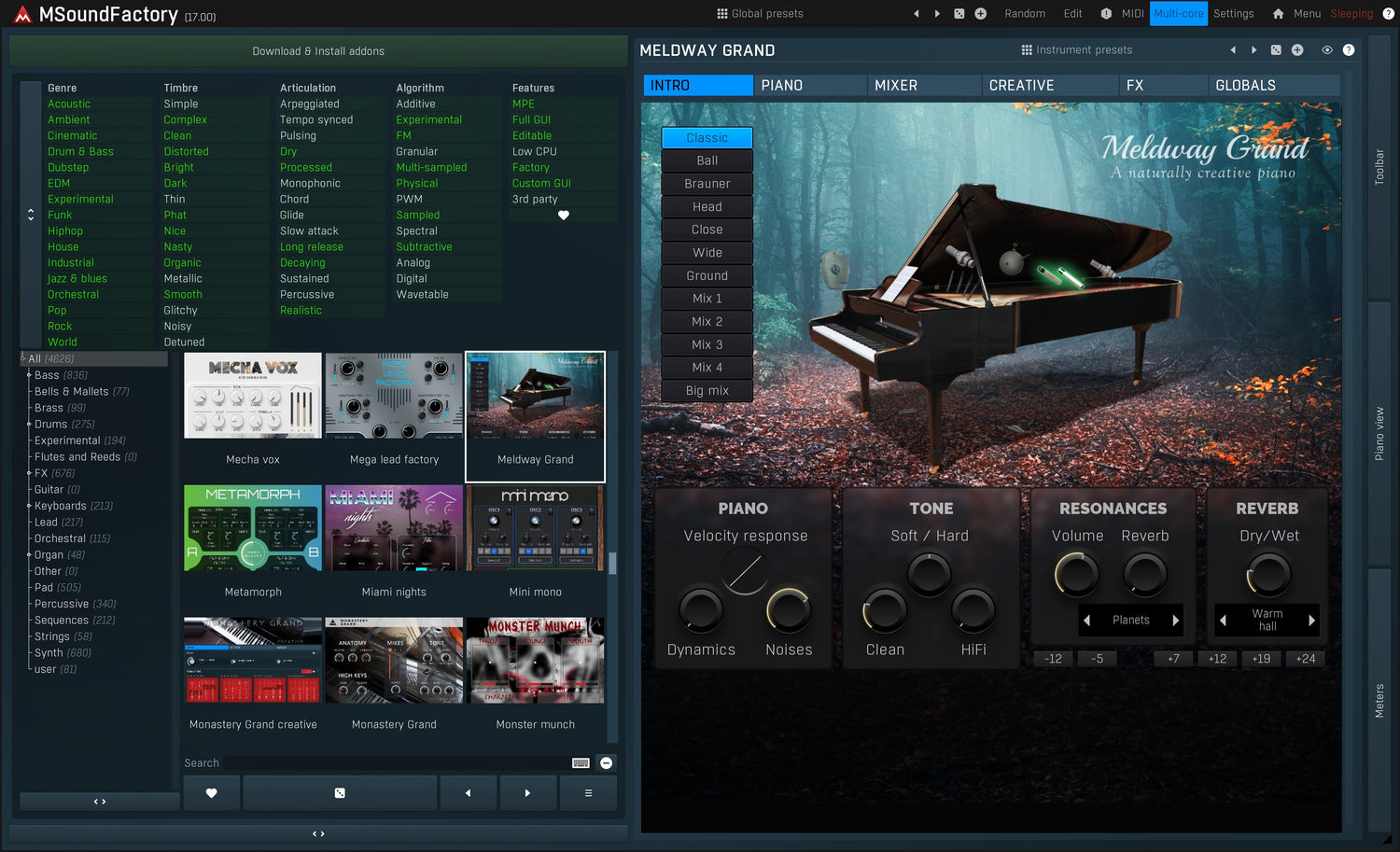 Imagina un bajo 808, ¿comprarías un plugin dedicado para ello, verdad? Bueno, no necesitas hacerlo, porque eso es un instrumento dentro de MSoundFactory. Al igual que un piano de cola, un piano eléctrico, un órgano, varios sintetizadores, bajos, etc. ¡Y estamos creando más mientras hablamos!