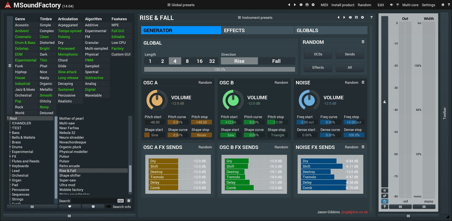 MSoundFactory ofrece cientos de sonidos predefinidos disponibles a través de presets globales, al igual que cualquier otro instrumento. Sin embargo, la verdadera maravilla es el sistema categorizado de instrumentos. Un instrumento no es solo un sonido, potencialmente con algunos controles macro. Es un "instrumento" completo, con muchas configuraciones y sus propios presets.