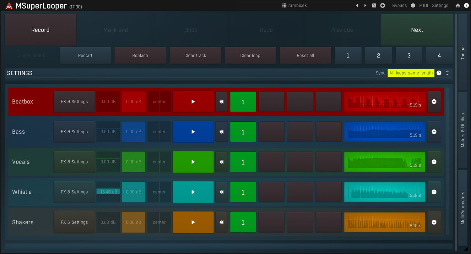 Los loopers solían tener solo una pista. Eso puede ser suficiente para capturar una idea rápidamente, pero definitivamente no es suficiente para una gran actuación en vivo. MSuperLooper cuenta con hasta 16 pistas, 4 loops en cada una para mayor versatilidad.