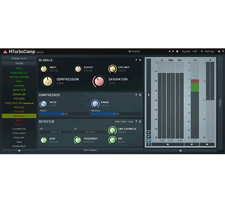 Así que nos tomamos la libertad de establecer un nuevo estándar. Todos los compresores que emula MTurboComp tienen casi la misma interfaz gráfica de usuario, para que siempre sepas qué hacer. Tienen los controles que tenían los originales, pero tienen mucho más que eso: Compresión para controlar la cantidad de compresión con cambios mínimos en el nivel de salida, Saturación para obtener carácter adicional, control seco/húmedo para compresión paralela, y finalmente, entrada de side-chain, detector de paso alto, paso bajo y filtros de pico, para que puedas ajustar fácilmente el compresor a tu material de audio. Las clásicas características de Melda, como la compensación automática de ganancia, limitador de seguridad, procesamiento mid/side y instantáneas A-H están incluidas, por supuesto.